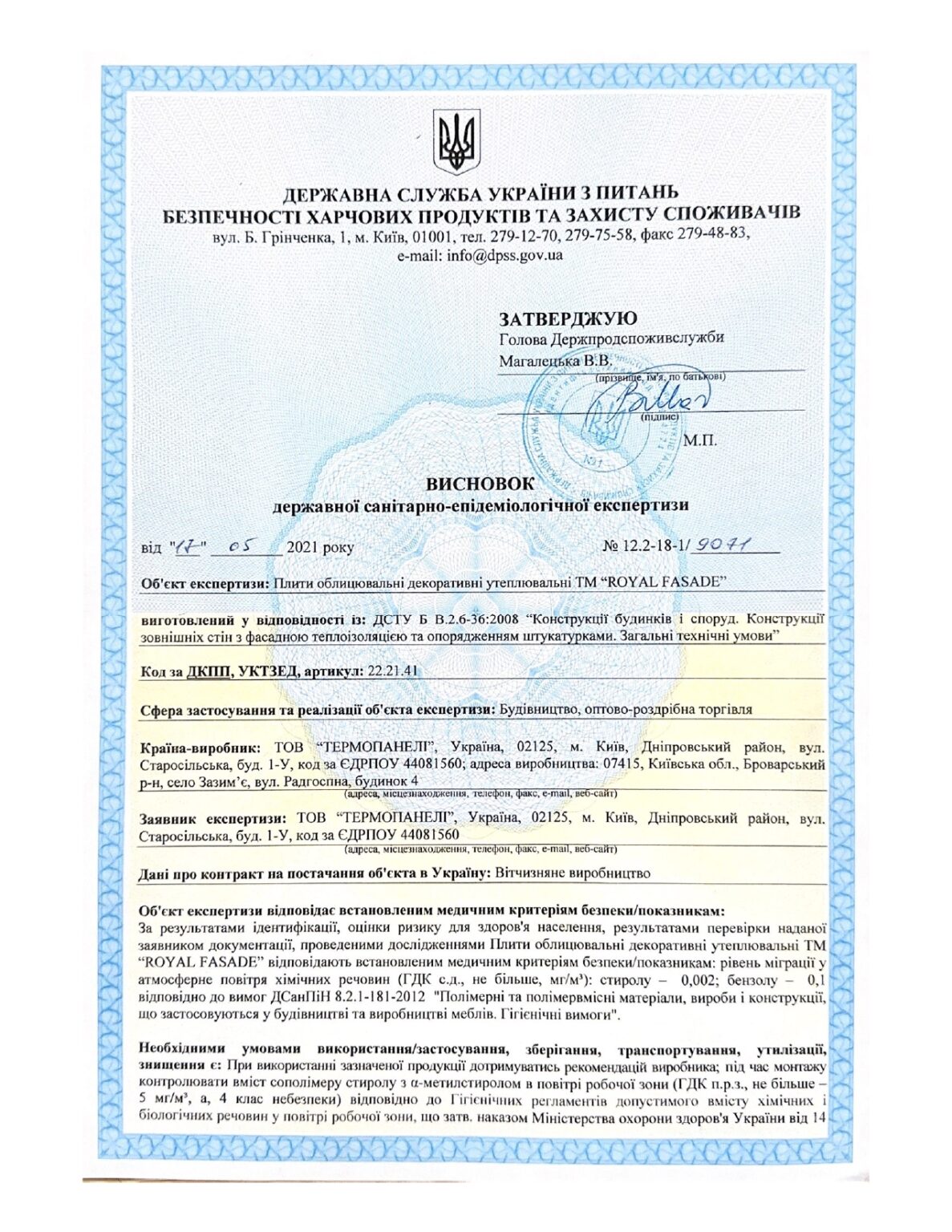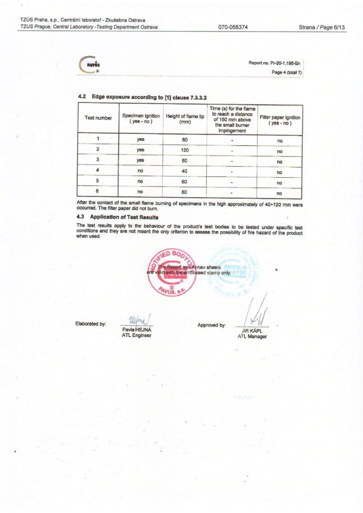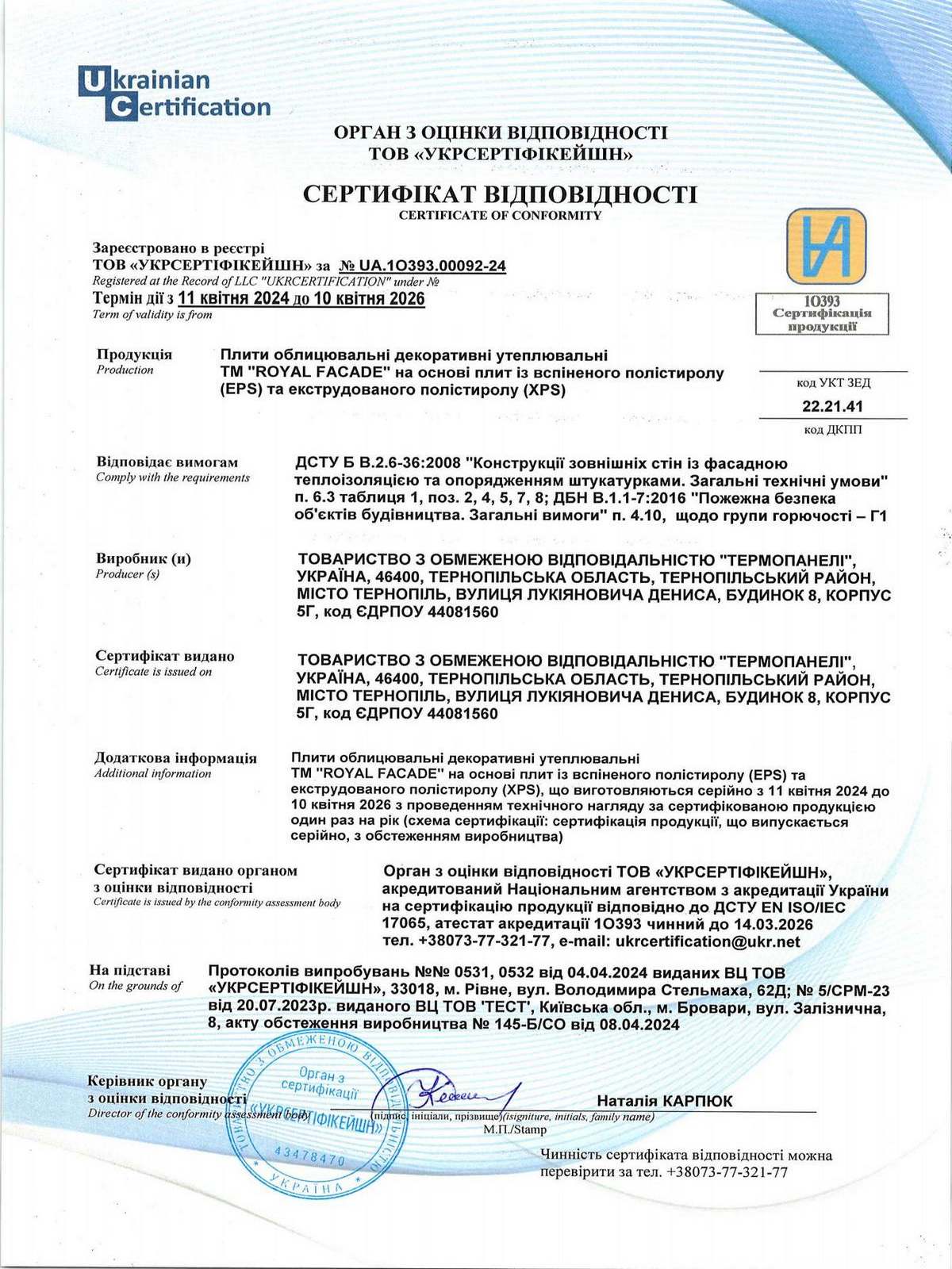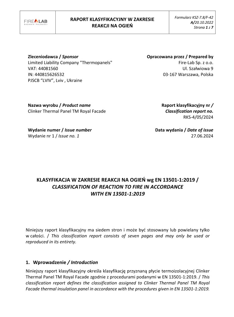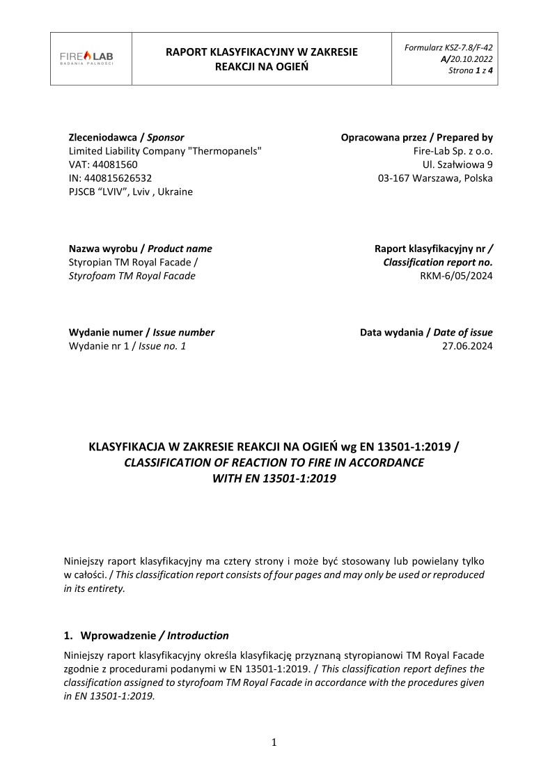 Underneath are presented the documents, received by the Royal Facade company as a result of the certification process in research laboratories
