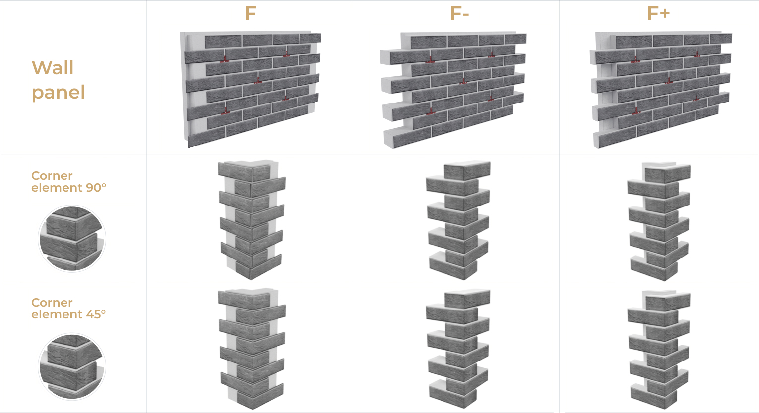 Klinkerové termopanely ™ Royal Facade se rozlišují ve třech typech – typy F, F- a F+. Podívejme se na každý z nich jednotlivě.