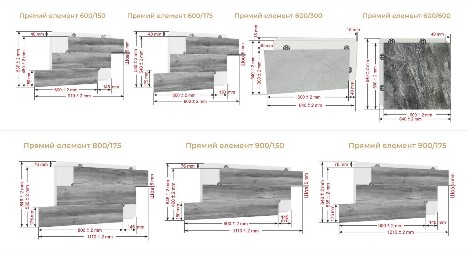 Stěnový termopanel různých formátů (32 dlažic, které jsou lisovány do izolace s čtvrtkovými zámky po celém obvodu nebo pouze horizontálně, s plným lepením dlažice nebo s částečně vyčnívajícími částmi dlažice nad izolaci).